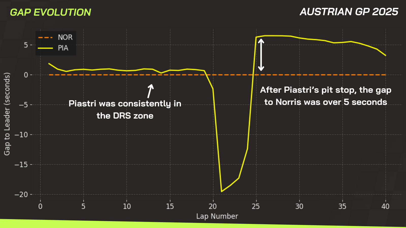 Meanwhile, Lando, running on fresh tyres, was lapping about a second faster per lap. By the time Piastri finally came in for his stop on lap 24, the gap between the two McLaren drivers had grown to over five seconds.