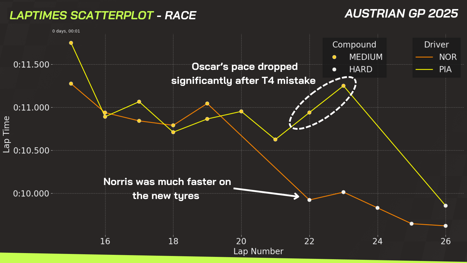 Norris came in on Lap 20. That same lap, Piastri made a costly error at Turn 4, locking his front-right tyre.
