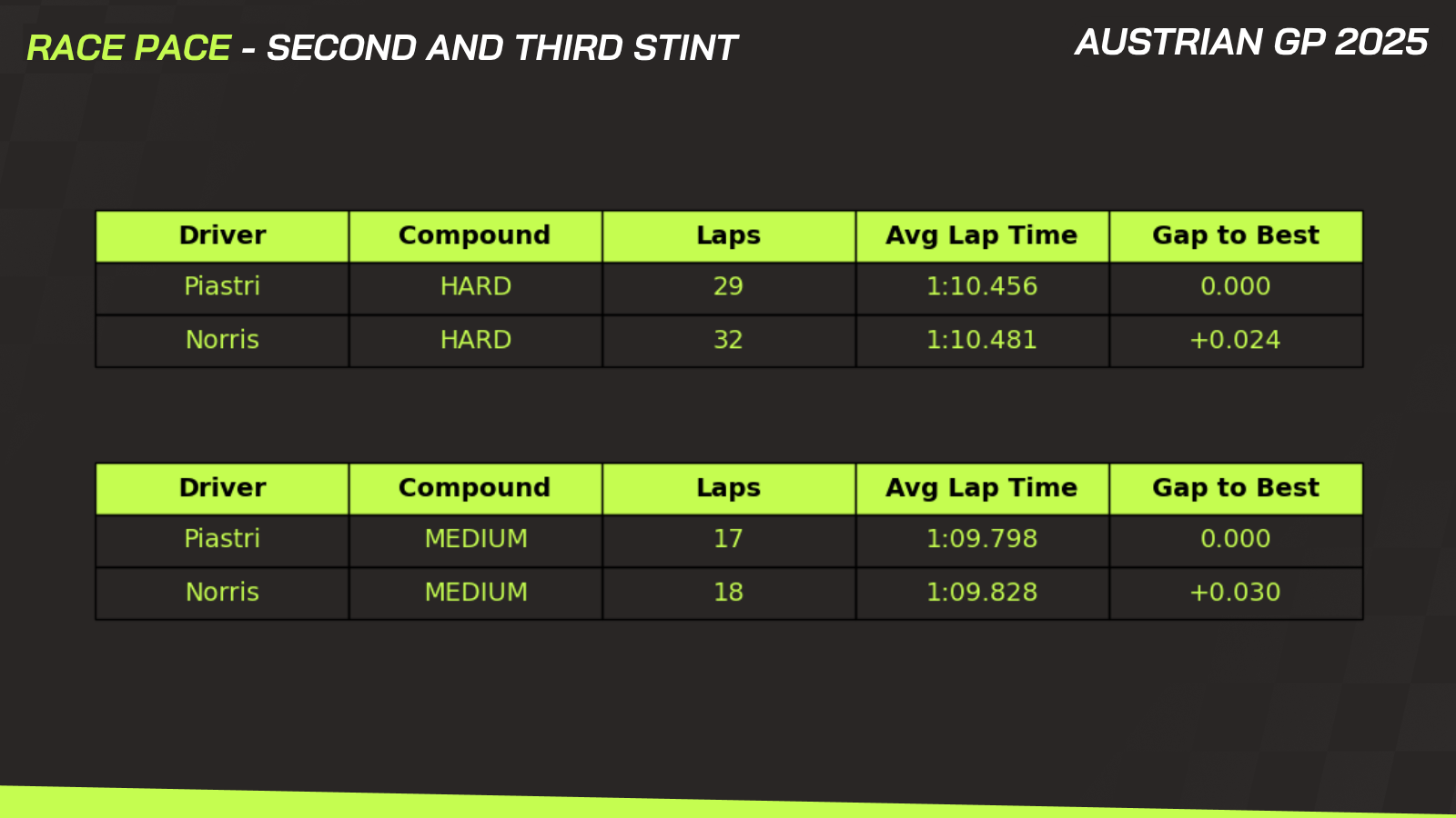 In the second and third stints, Piastri was consistently a little faster — not by a huge margin, but enough to close in towards the end. Once again, this showed how much cleaner air helped his pace.