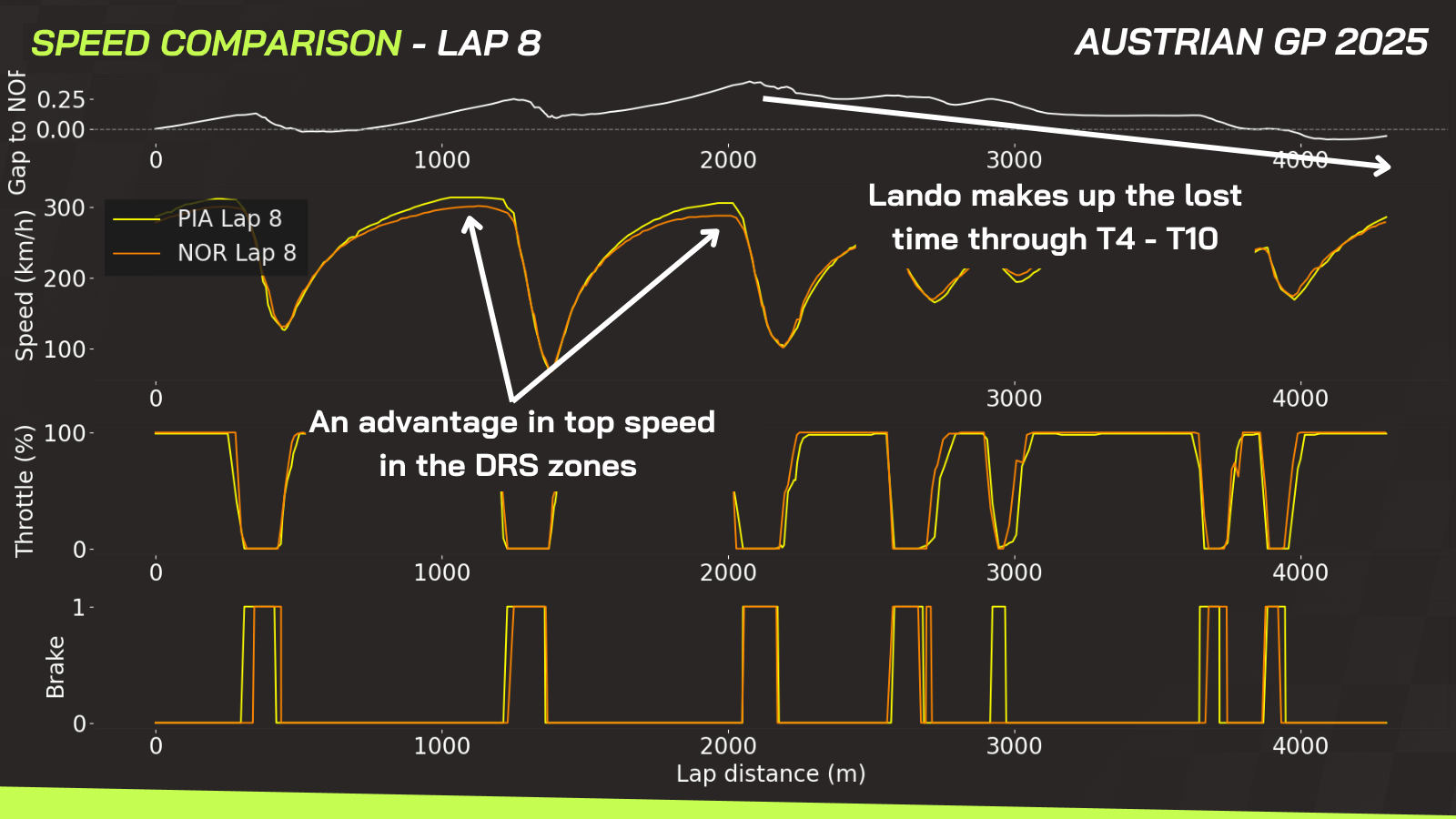 By analysing the lap data from the first stint, a clear pattern emerges that repeated almost from Lap 1 through to Lap 20: with the help of the DRS system, Piastri consistently achieved a much higher top speed and was able to close the gap on all three straights. However, from Turn 4 through to the end of the lap, it was Norris who could make use of better grip and traction, which allowed the gap to increase once again — and so the cycle continued lap after lap.